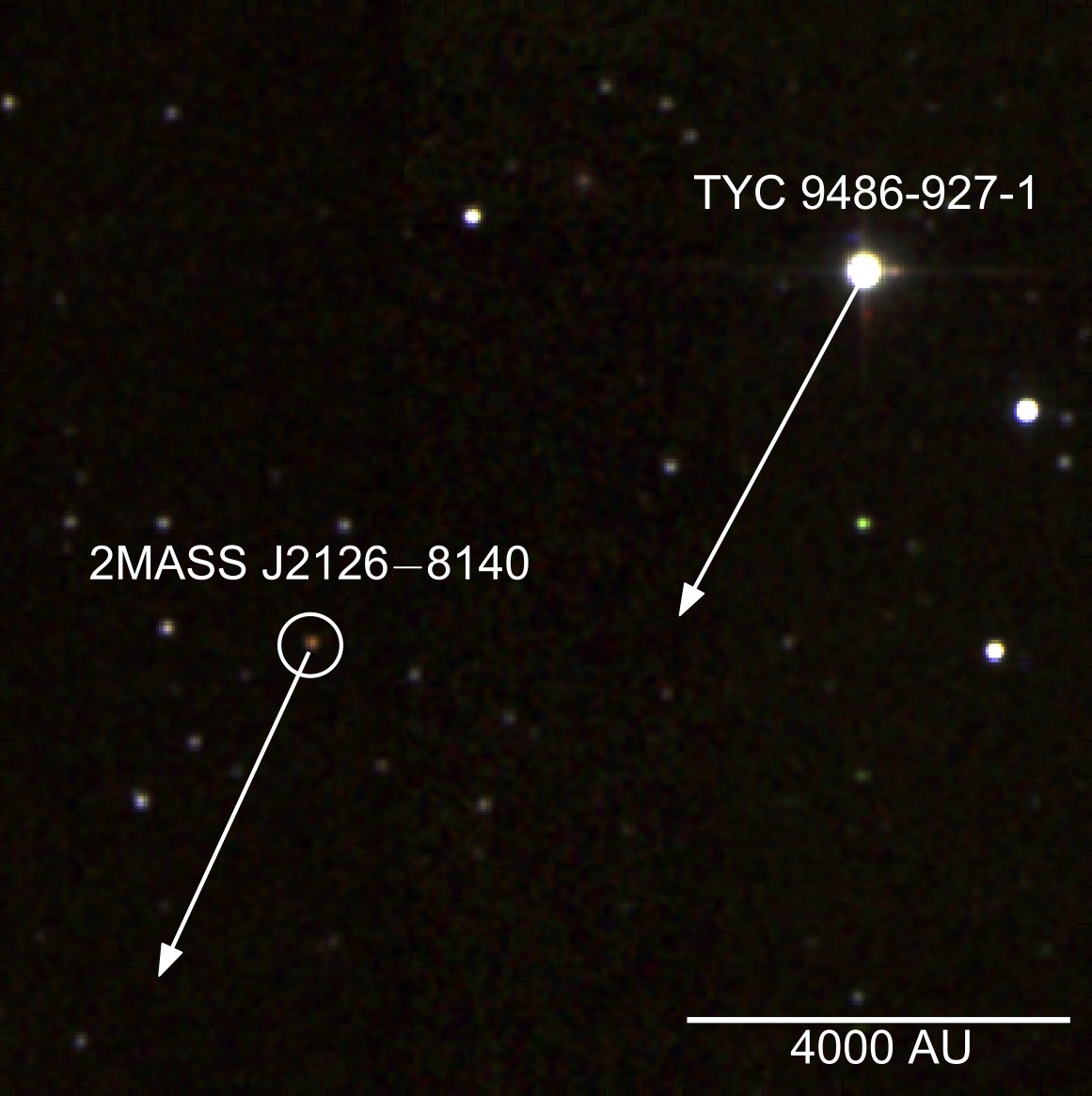 Osservando il cielo da una sua ipotetica luna rocciosa, il nostro Sole apparirebbe una stellina debole posta a metà strada tra Altair e Procione.